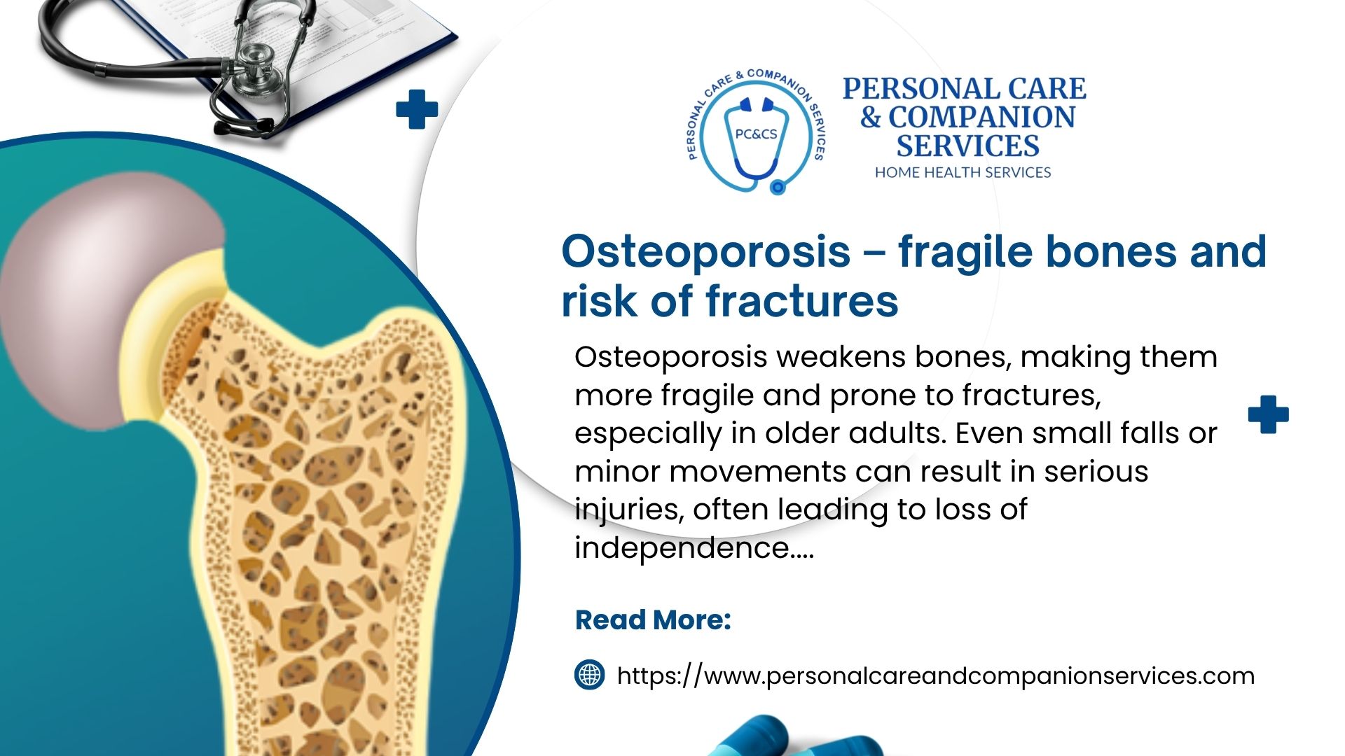 PCCS caregivers help reduce these risks by promoting safe mobility, assisting with fall prevention strategies, providing medication reminders, and encouraging weight-bearing activities to strengthen bones. Our structured support ensures individuals with osteoporosis can remain active and safe in their own homes.